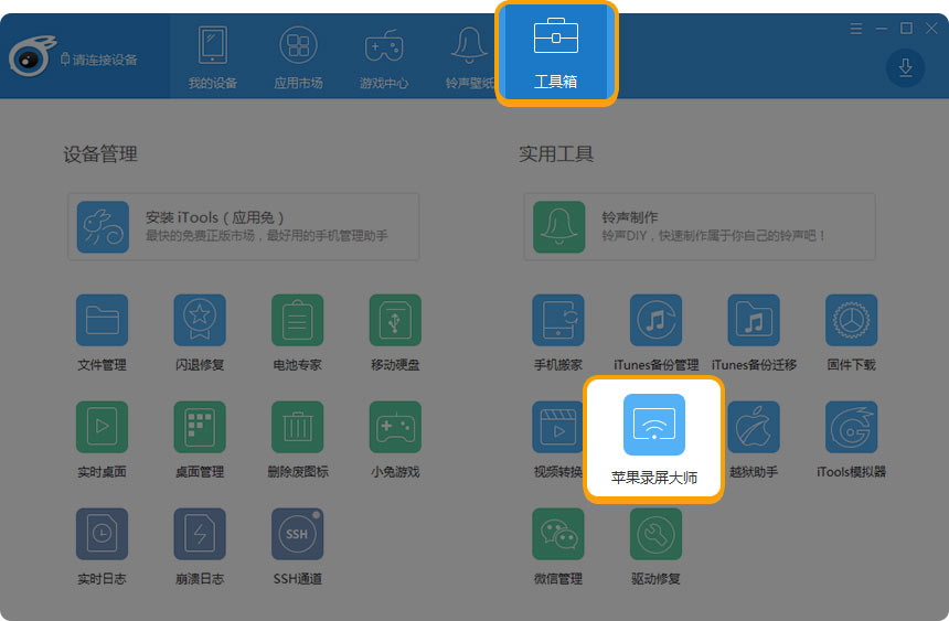 在itools的【工具箱】里找到并使用苹果录屏大师