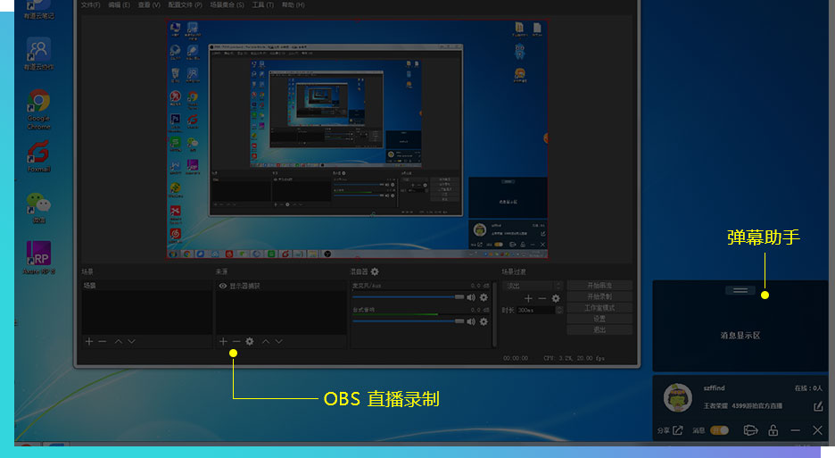 直播窗口由 [OBS] 与 [弹幕助手] 构成,OBS主要用于直播录制,弹幕助手主要